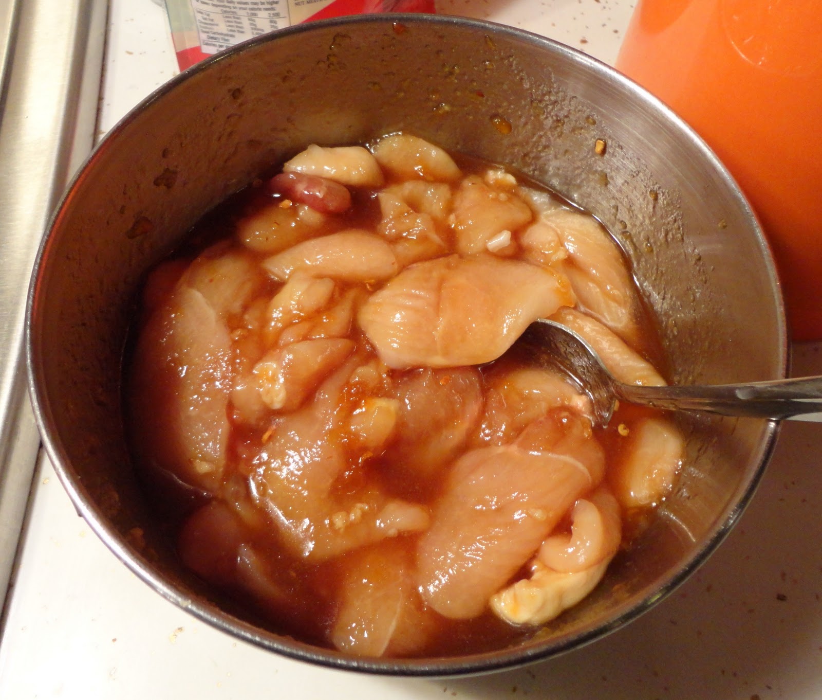 Slice meat into thin strips. Add meat to marinade, toss and let sit 15 minutes.