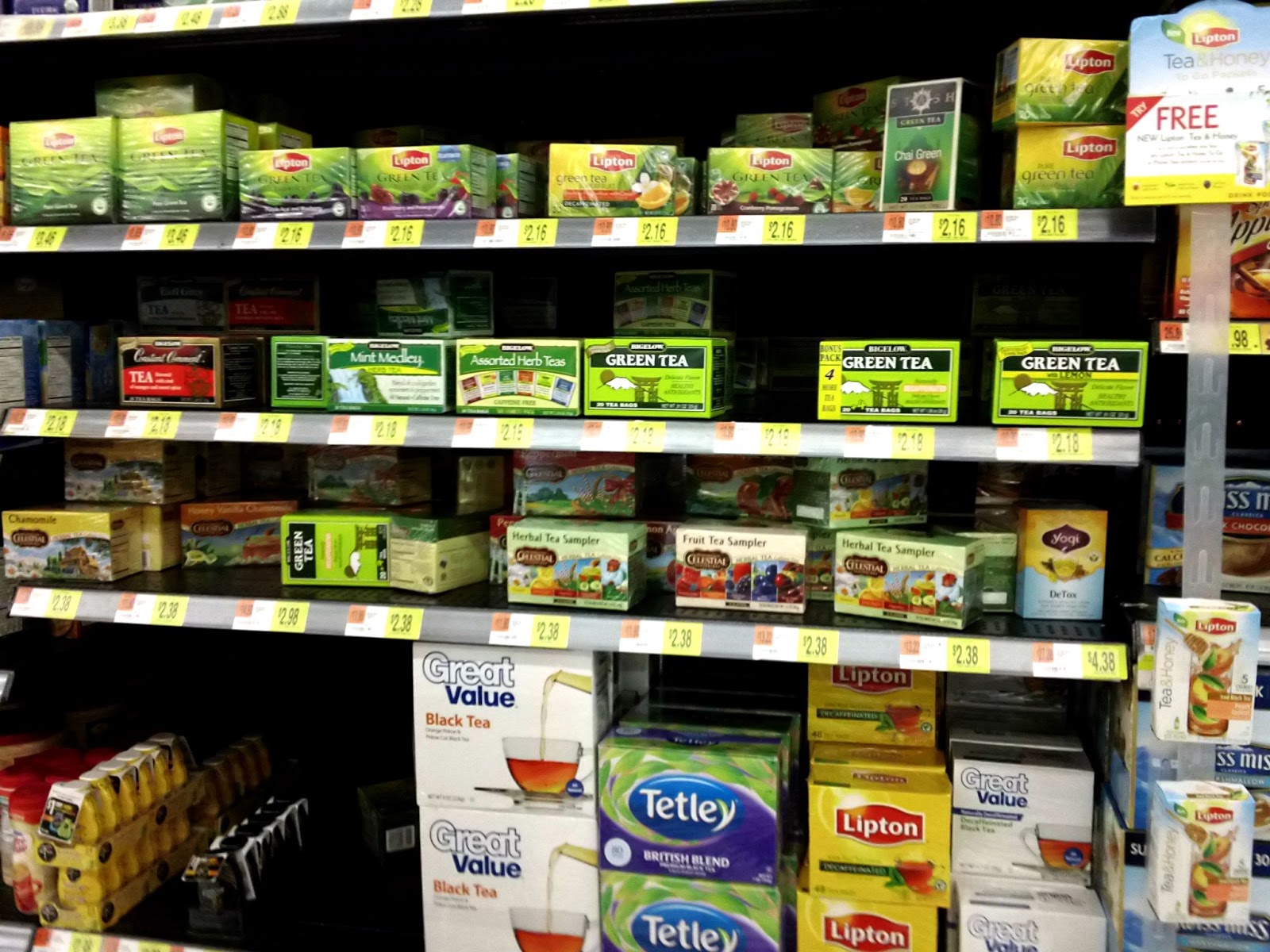 Alison: They didn’t have as large a selection of tea as I’d hoped. For such a large retailer I was surprised to see only a few varieties of Bigelow tea on the shelf. Also so poorly stocked.