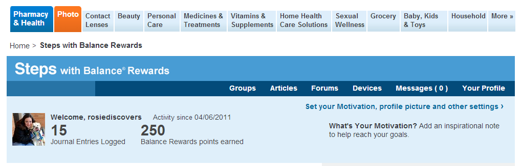 We always are looking out for new ways to stay healthy. So, we were more than happy to add an extra check to our exercise program: Balance Rewards. A store that we shop at that gives us rewards for being healthy? Sounds like a steal to me! Do they know they’re giving us gifts for being healthy? It almost seems like someone forgot to tell Walgreens they were giving away free products!! All we have to do is walk! Something we do best with Rosie.